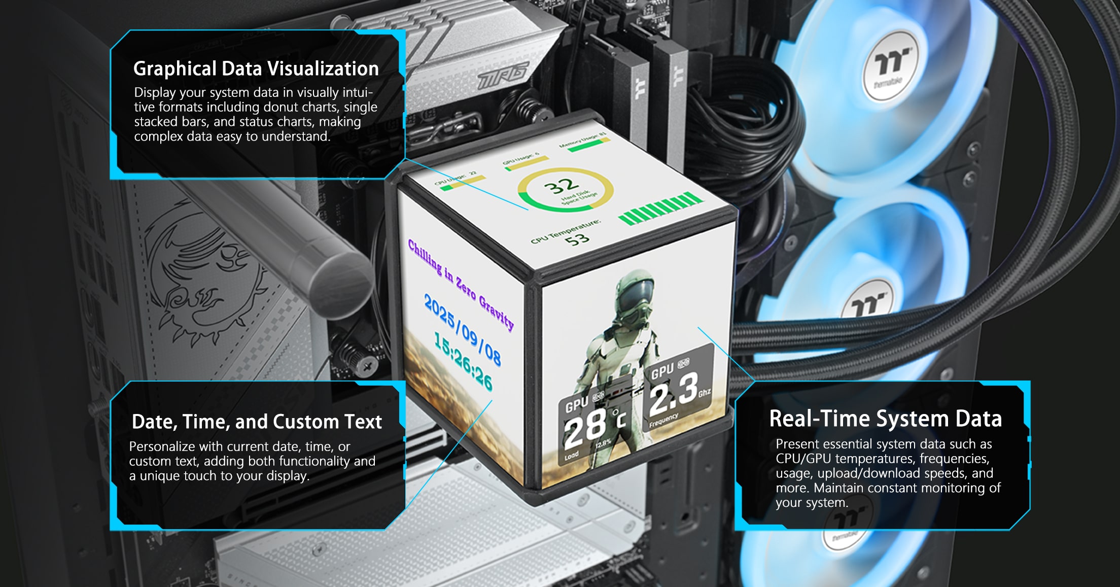 Thermaltake launches dedicated software for MINECUBE 360 Ultra, allowing full customization of the screen. Choose your preferred background and display your favorite real-time system stats or personal information with ease.